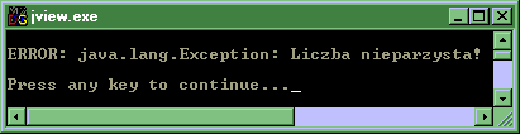 W metodzie Liczba.dziel() klasy WywolajWyjatek,throw new Exception("..."), generujemy wyjątek poprzez utworzenie obiektu typu ExceptionThrowable. W programach zawsze generujemy wyjątki typu ExceptionsExceptions. W ten sposób można w Javie wywoływać wyjątki, dla sytuacji, które uważamy za nieprawidłowe. W powyższym przykładzie założono, że nieprawidłowa jest sytuacja gdy zmienna 'i' jest liczba nieparzystą lub jest równa zero. W obu przypadkach generowany jest wyjątek, choć z innym komentarzem. W definicji metody dziel()throws Exception, jej użycie informuje maszynę wirtualną Javy i metodę wołającą, że metoda może generować wyjątek typu Exception. Użycie tej frazy jest obowiązkowe, jeśli nasza metoda może generować wyjątek. Każda metoda, która woła metodę dziel()catch) obsługujący wyjątek albo informację throws Exception, że może być źródłem wyjątku pochodzącego z metody, którą woła w swoim ciele. Przykładem tego jest metoda main(), która nie ma obsługi wyjątku a tylko frazę throws Exception. W naszej aplikacji wygenerowany błąd nie zostaje nigdzie obsłużony, więc program kończy działanie, a na ekranie widzimy: