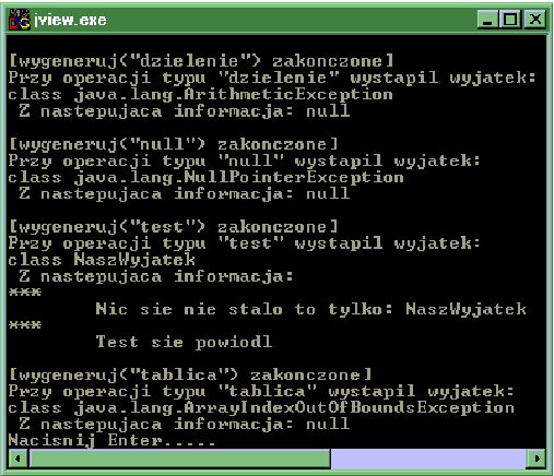 Jak widać na ilustracji 2-7 aplikacja w Javie po wystąpieniu wyjątków tego rodzaju nie zawiesza się ale może je obsłużyć. W przykładzie obsługa sytuacji wyjątkowej sprowadza się do wydrukowania na ekranie informacji o wystąpieniu wyjątku i dodatkowego tekstu komentarza.