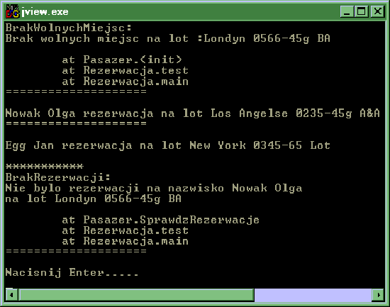 W celu sprawdzenia działania wszystkich powyżej zadeklarowanych klas stworzono klasę Rezerwacja,main() wywołana jest metoda testtest() w bloku tryPasazer (patrz linia /*14*/). Ponieważ dla obiektu lot[0]BrakWolnychMiejsc